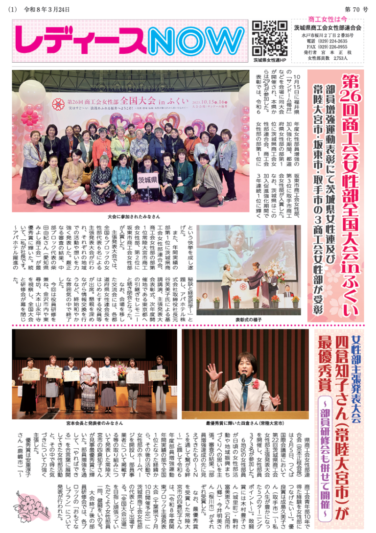 レディースNOW最新号を発行しました ●レディースNOW70号 〇第26回商工会女性部全国大会inふくい、女性部主張発表大会 〇いばらきレディースカレッジ2025U60特別講座、(第2回) 〇張り切り美人 〇トレンディ
